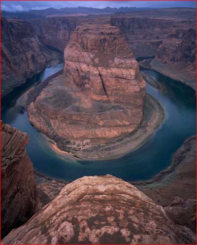 Queste due immagini furono create nel Marzo 2003 durante la mia ultima visita a questa area stupenda. Per prima creai quella che considero la visione “classica” della Horseshoe Bend, l’immagine orizzonatale a sinistra. In seguito pensai che non avevo mai visto una composizione verticale di questa scena. Capii che vi era l’opportunità di creare un’immagine nuova di un posto ultrafotografato. Pensai alla tecnica della relazione primopiano-sfondo anche se una composizione orizzontale primopiano-sfondo della Horseshoe Bend é assai difficile in quanto quasi tutto lo spazio dell’immagine é occupato dall’ansa del fiume. Così camminai nei dintorni alla ricerca di un elemento da piazzare in primopiano.